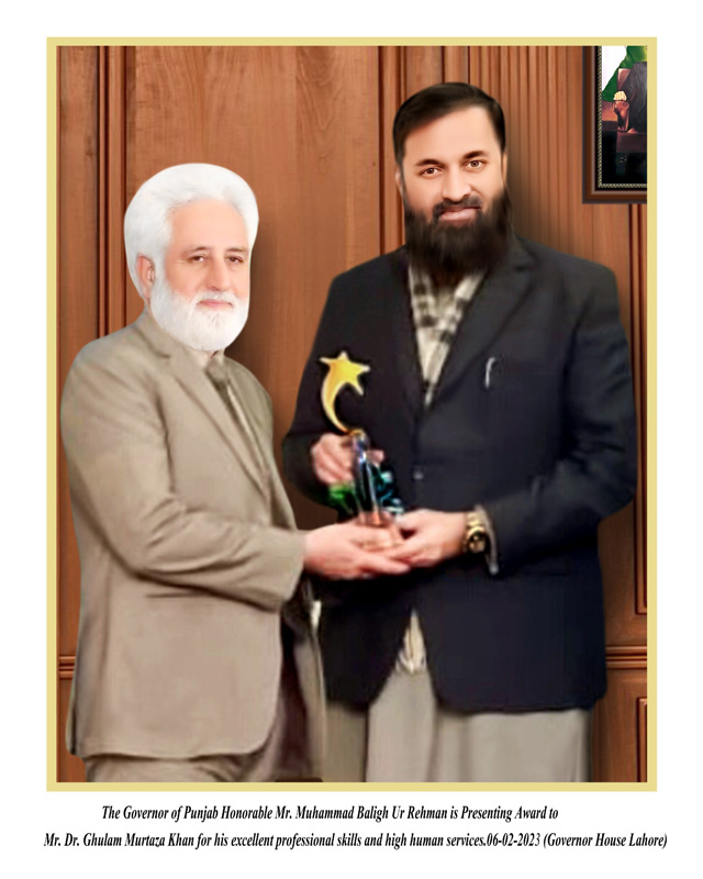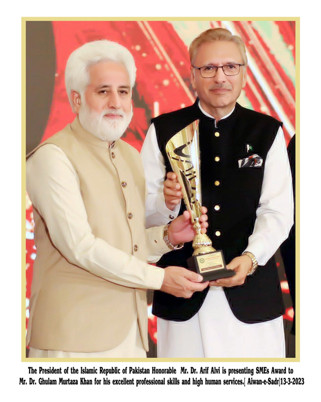 The President Of the Islamic Republic Of Pakistan Honorable Mr. Dr. Arif Alvi is presenting SMEs Award to Mr. Dr Ghulam Murtaza Khan for his Excellent professional and high human services (Aiwan-e-Sadr)13-3-2023